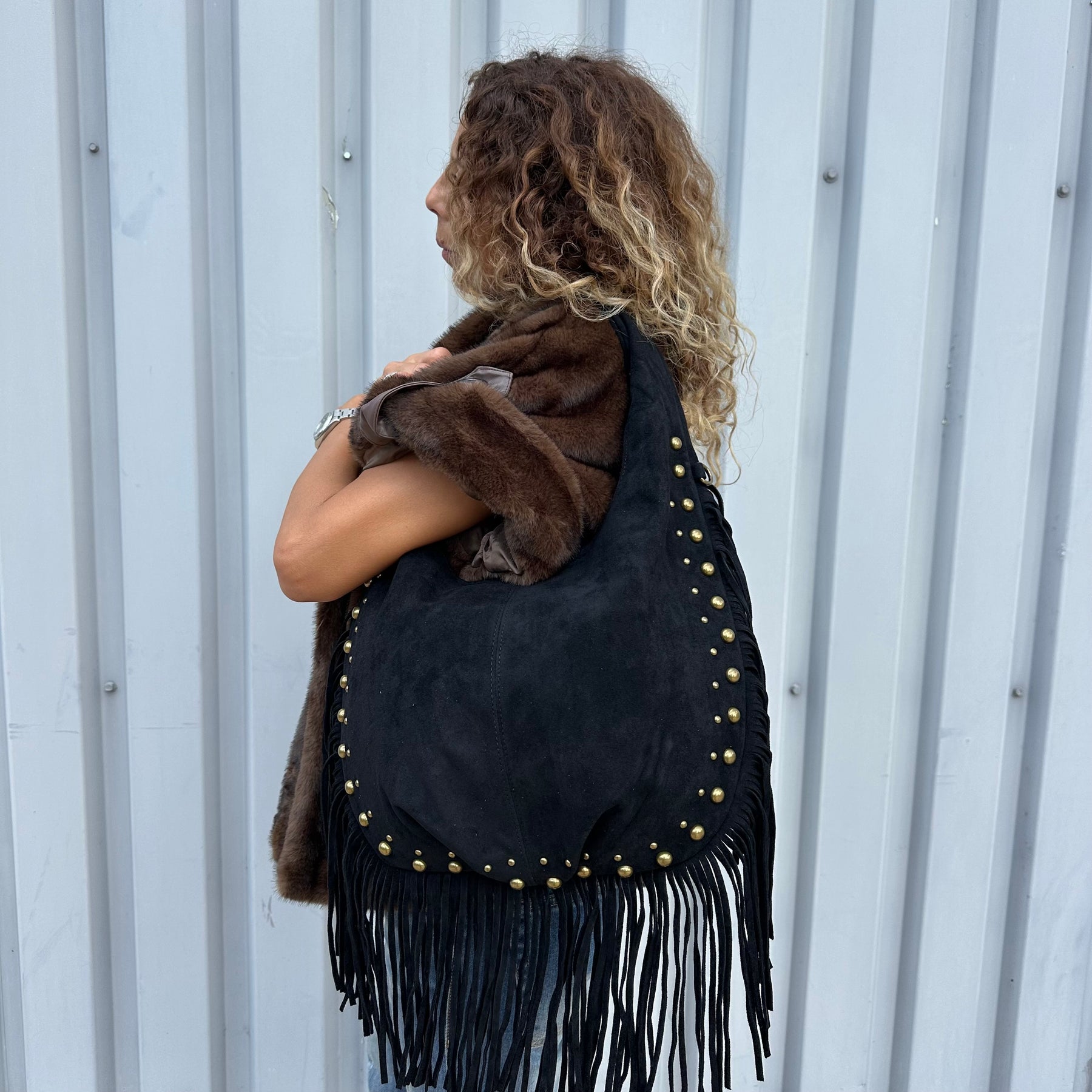 Sac hobo en suédine taupe,choco et noir à franges et clous dorés. 👜