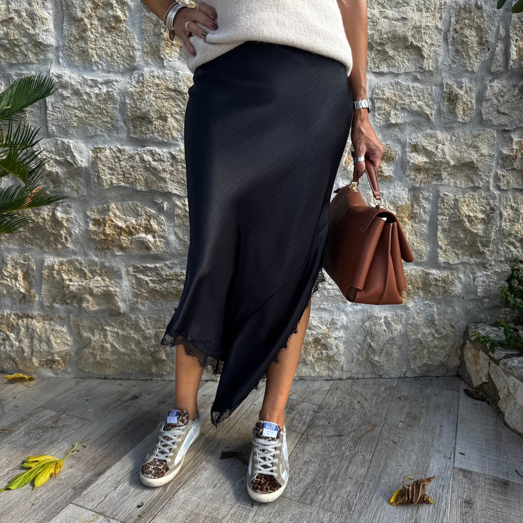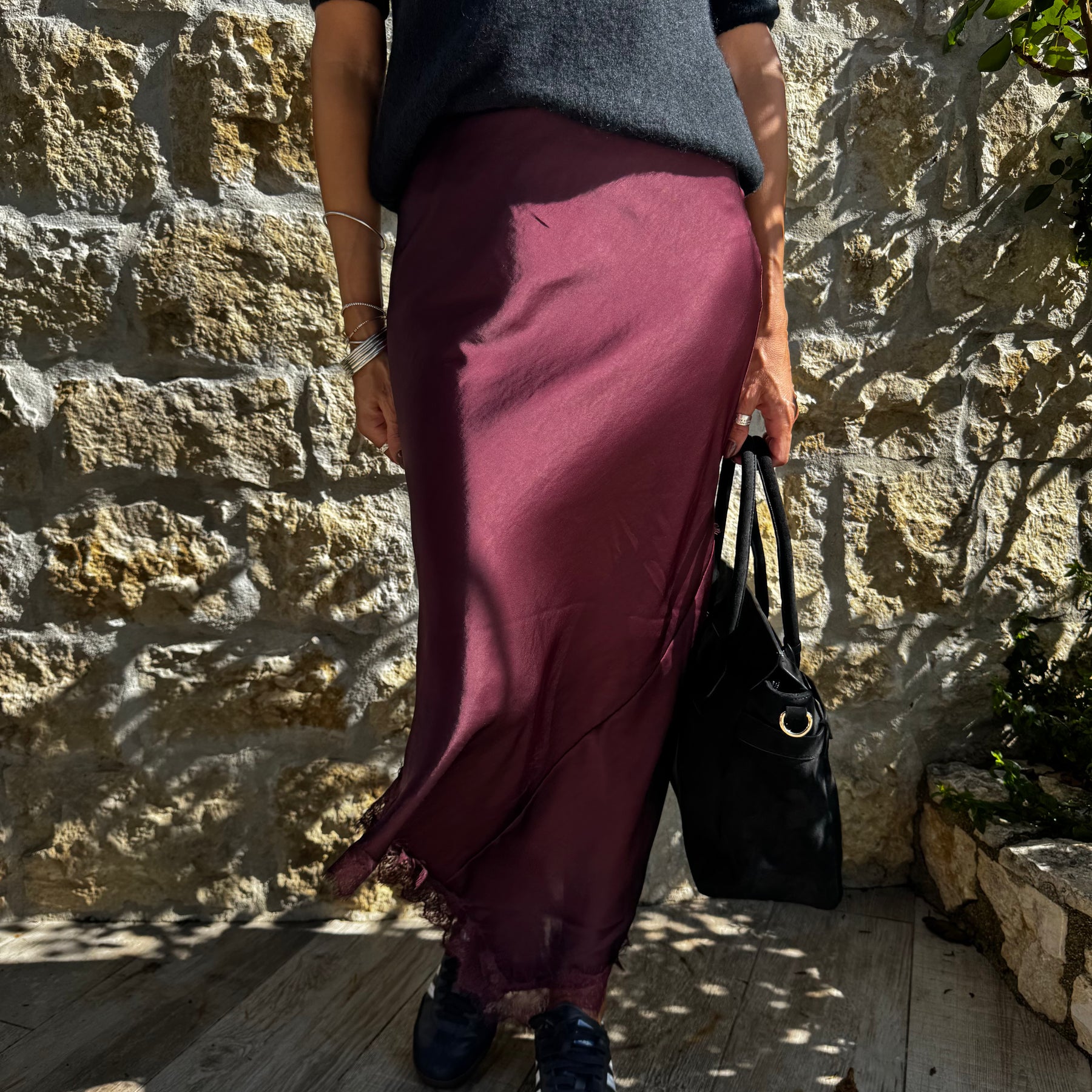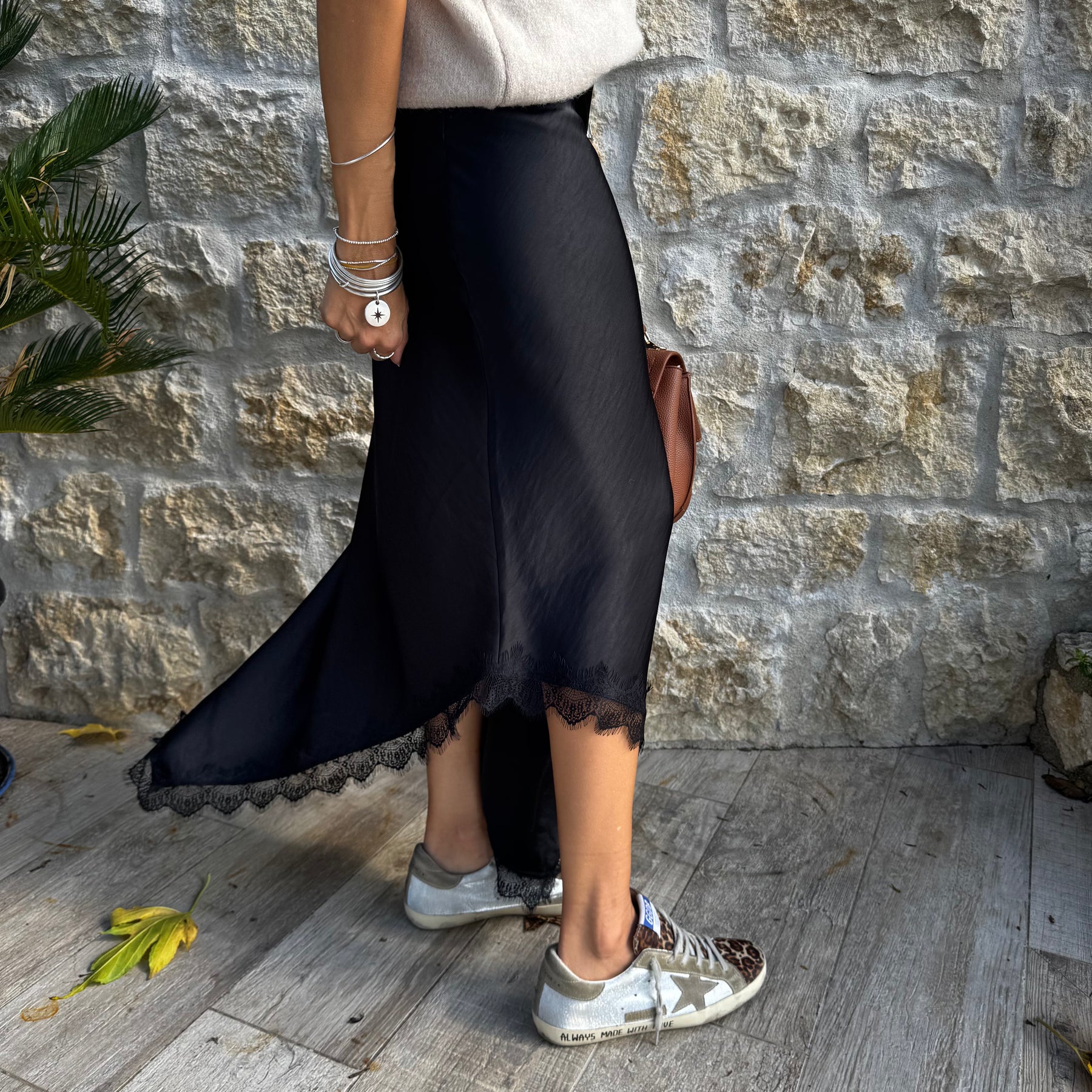 Jupe fluide et raffinée en satin, sublimée par des détails en dentelle et une fente féminine sur le coté.