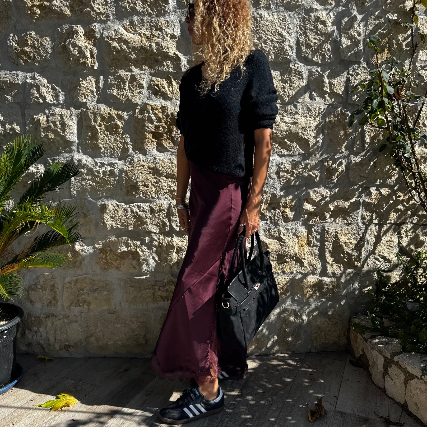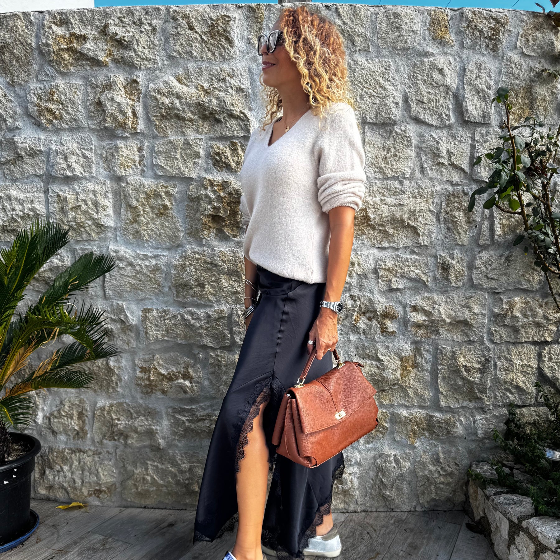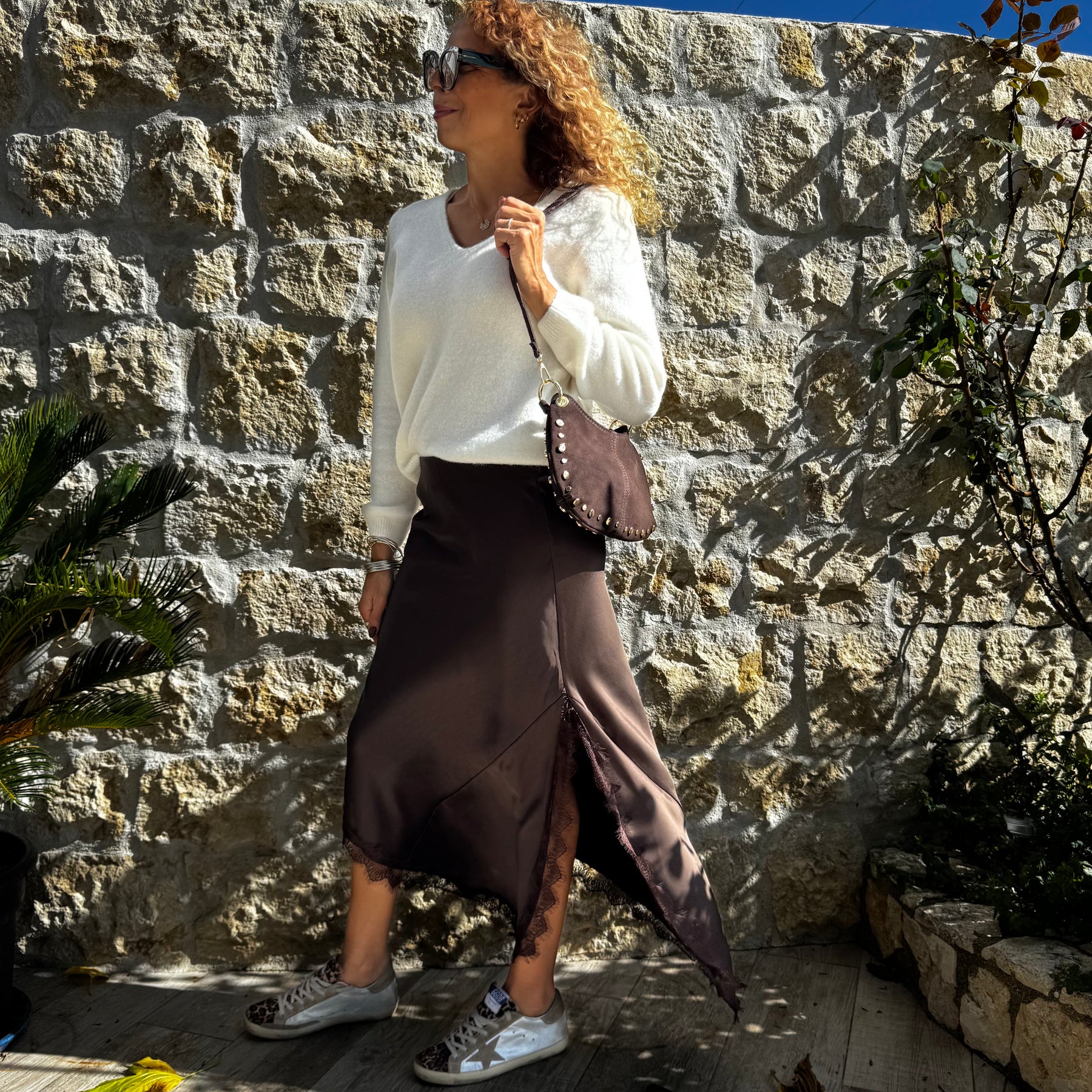 Jupe fluide et raffinée en satin, sublimée par des détails en dentelle et une fente féminine sur le coté.