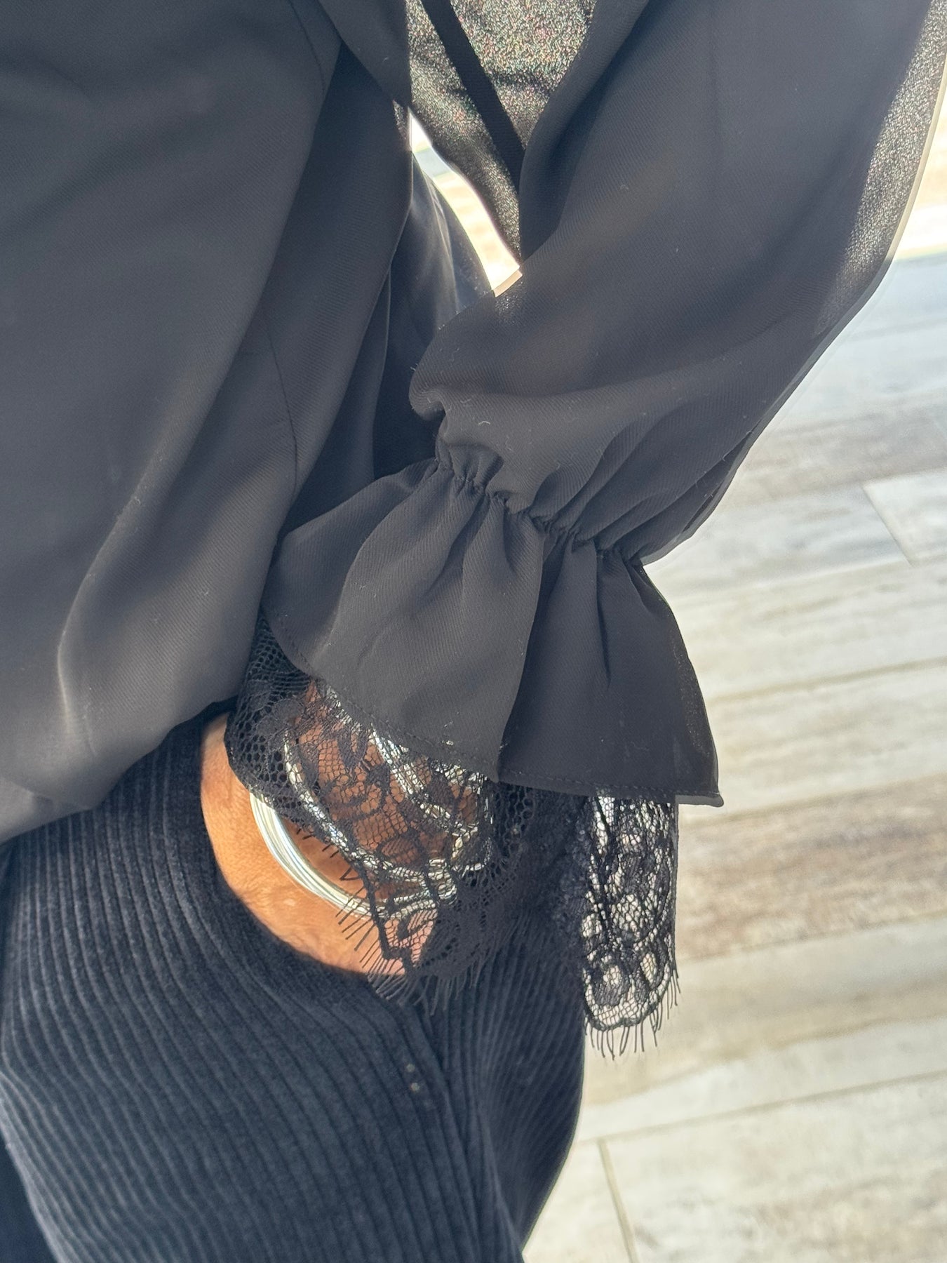 Manches longues bouffantes : resserrées aux poignets avec finitions dentelle, pour une allure raffinée.