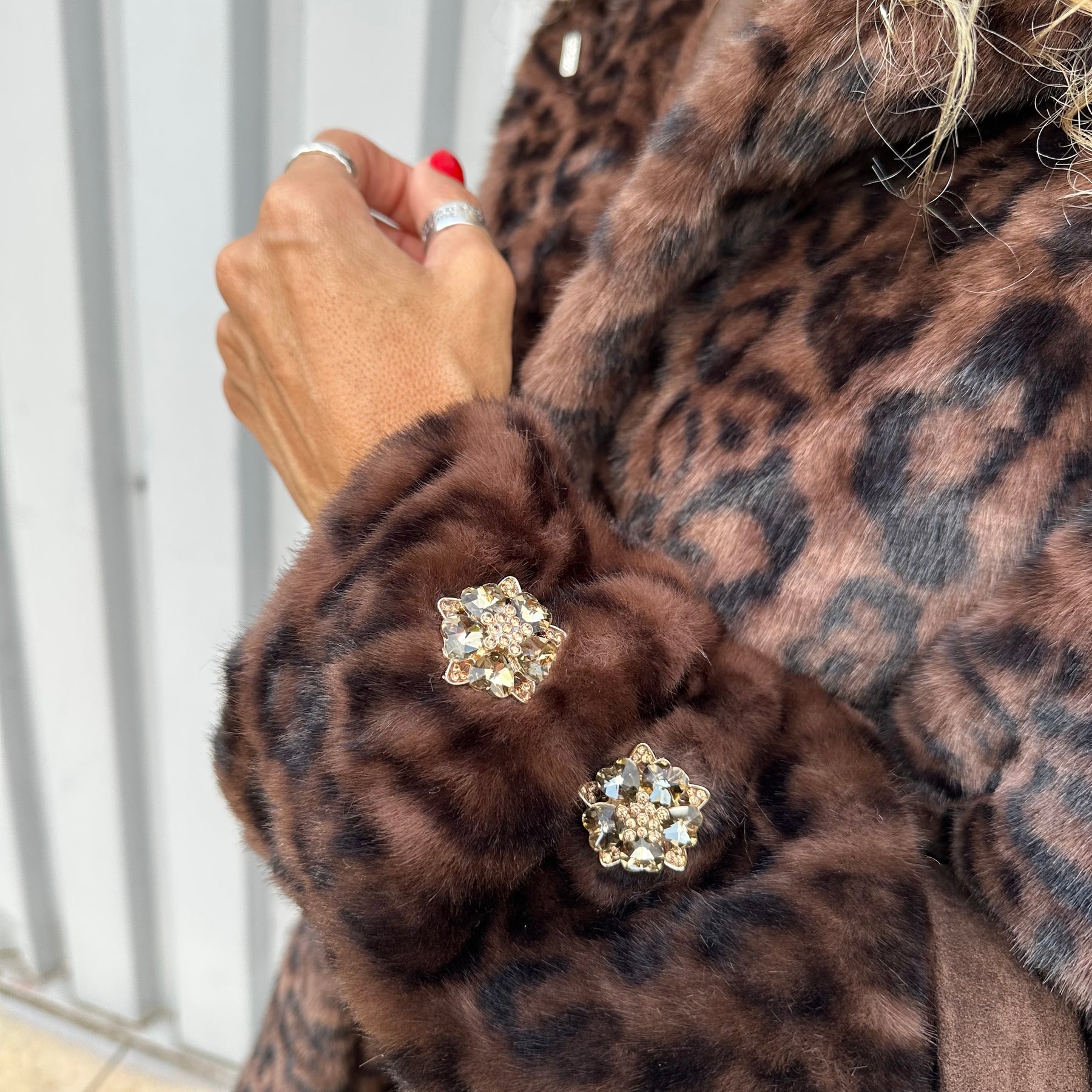 • Couleur : Marron chocolat à motif léopard foncé avec un détail de 2 faux boutons bijoux dorés sur les manches