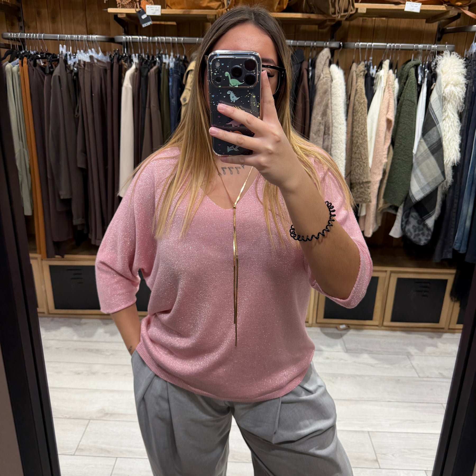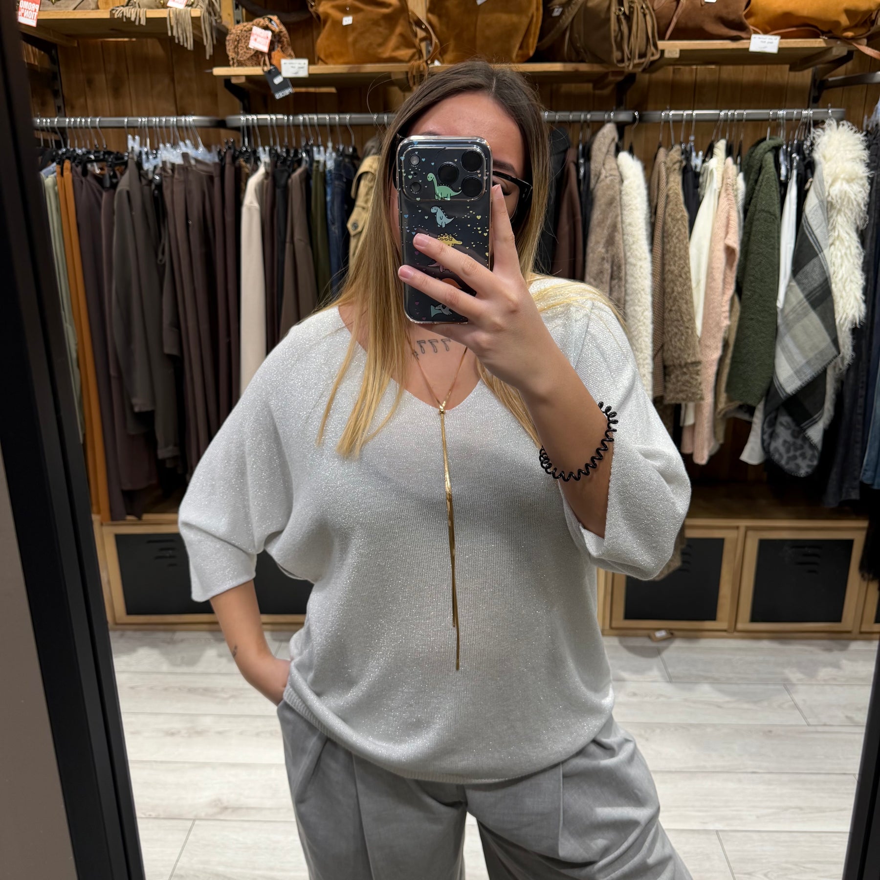 Ce top légèrement pailleté est la pièce parfaite pour illuminer vos tenues du quotidien comme vos looks plus habillés. Sa coupe fluide et son col en V apportent élégance et confort, tandis que sa matière brillante capte délicatement la lumière sans en faire trop.