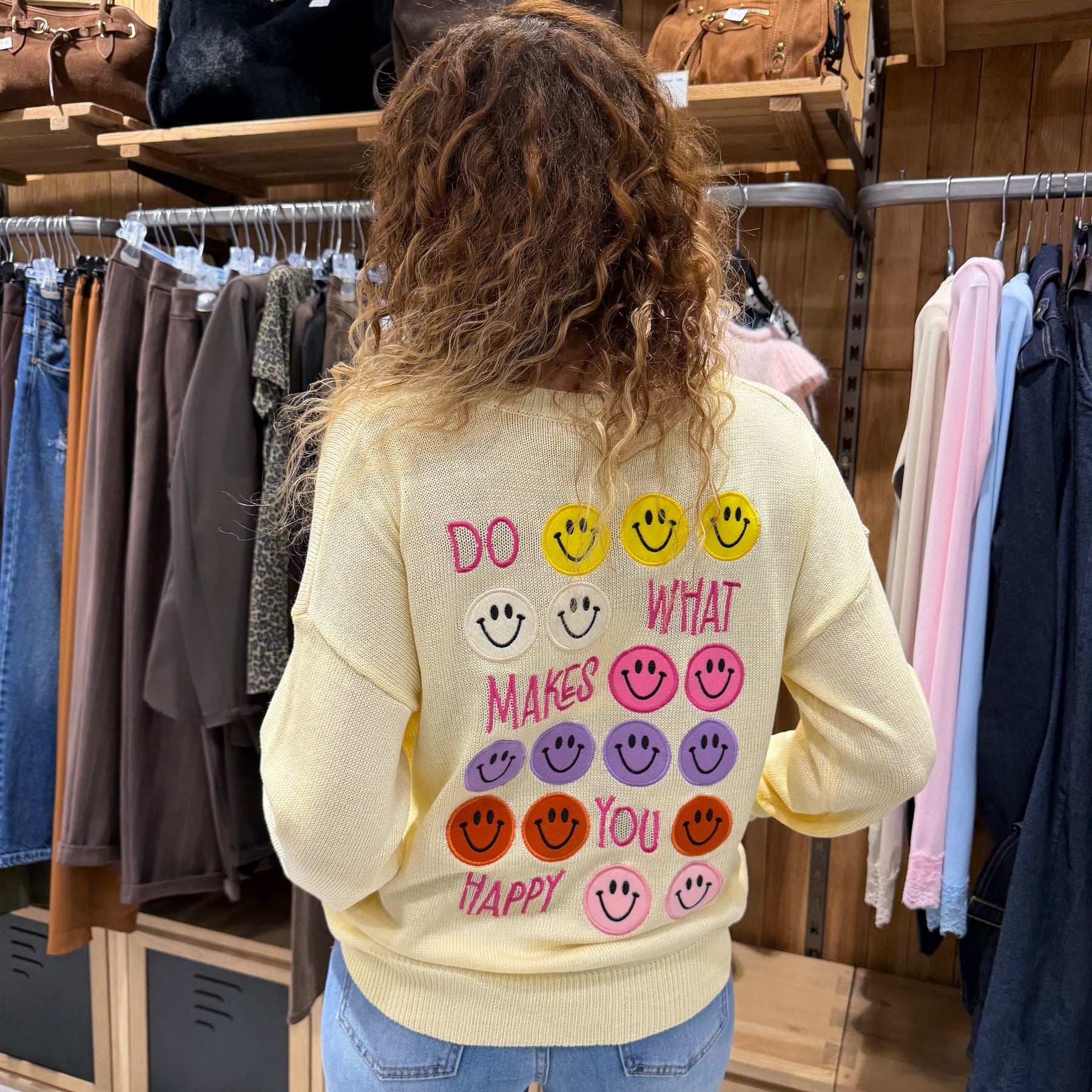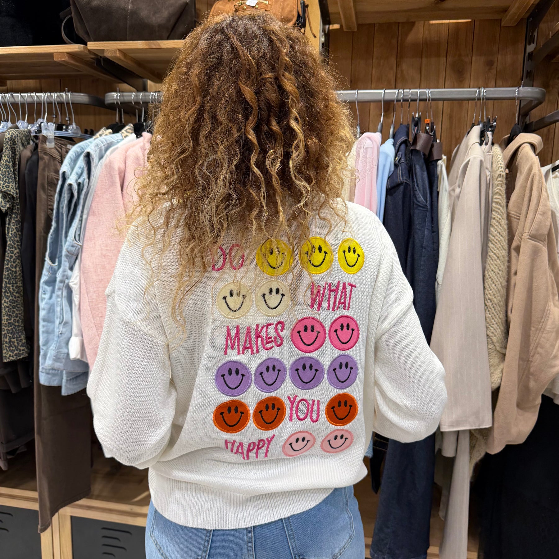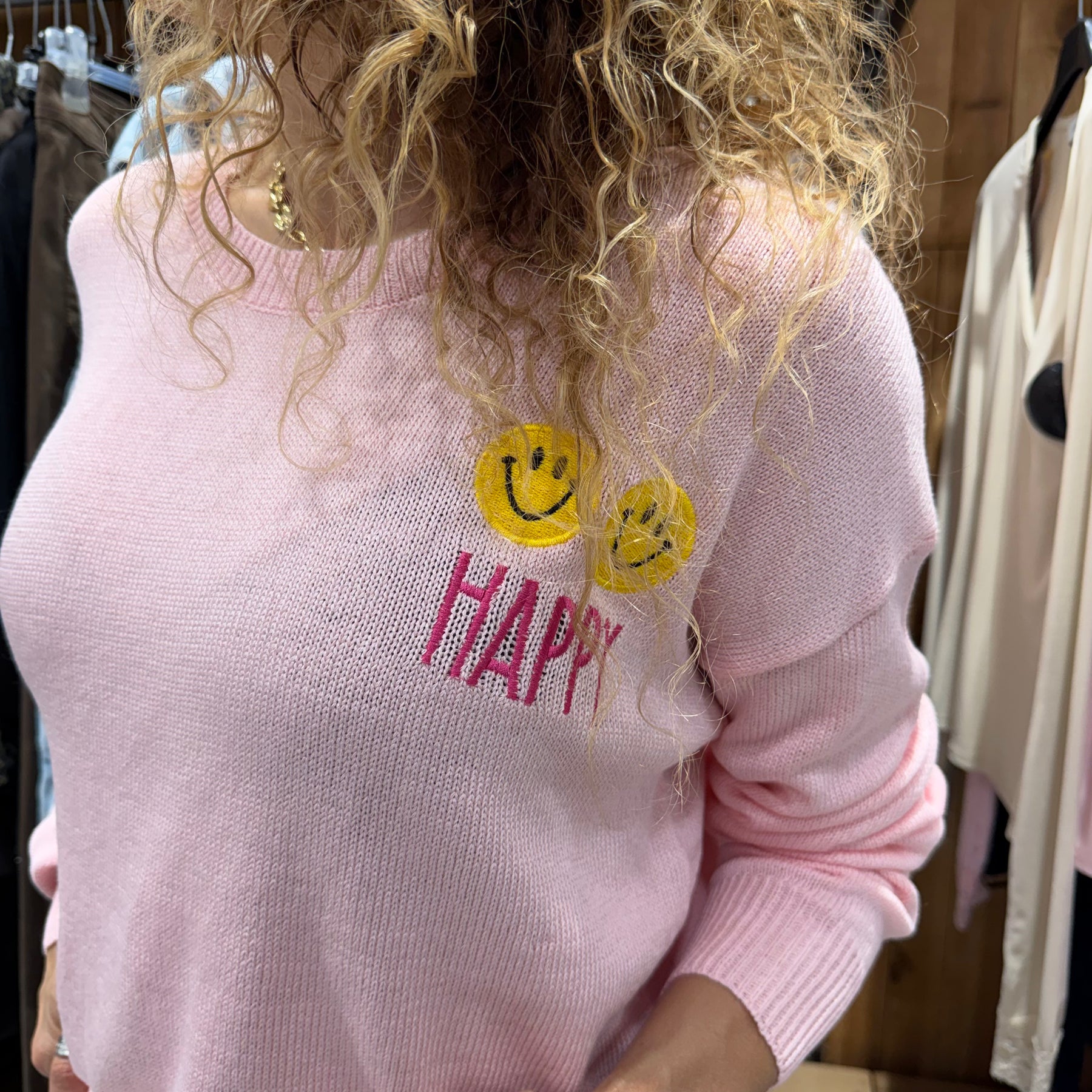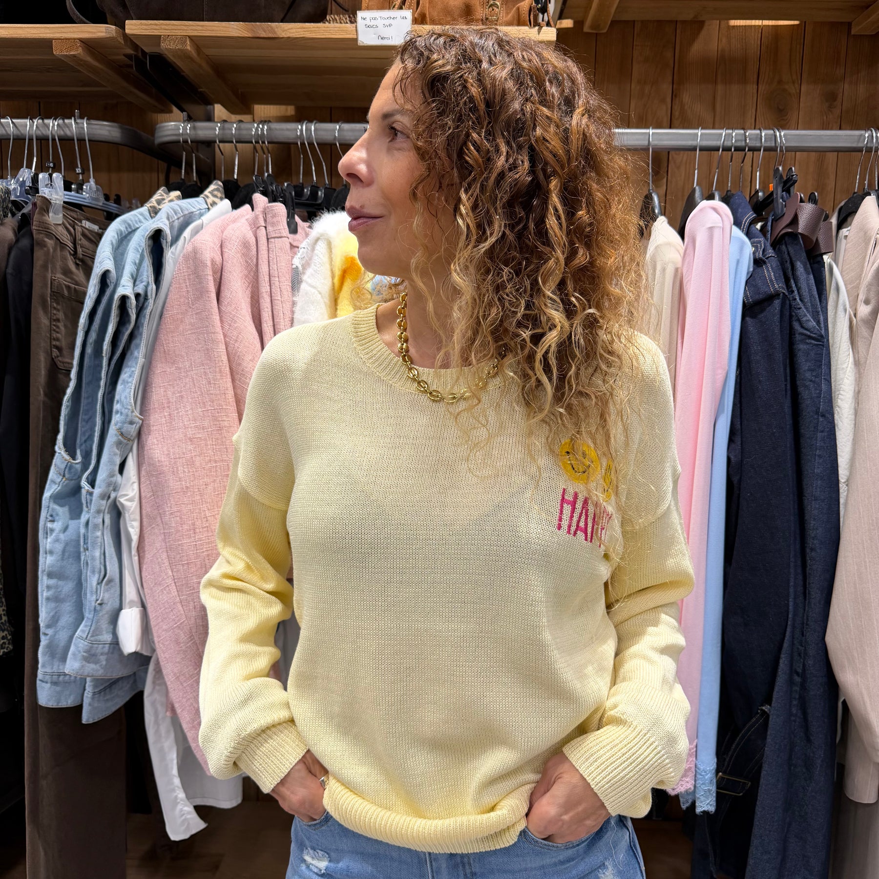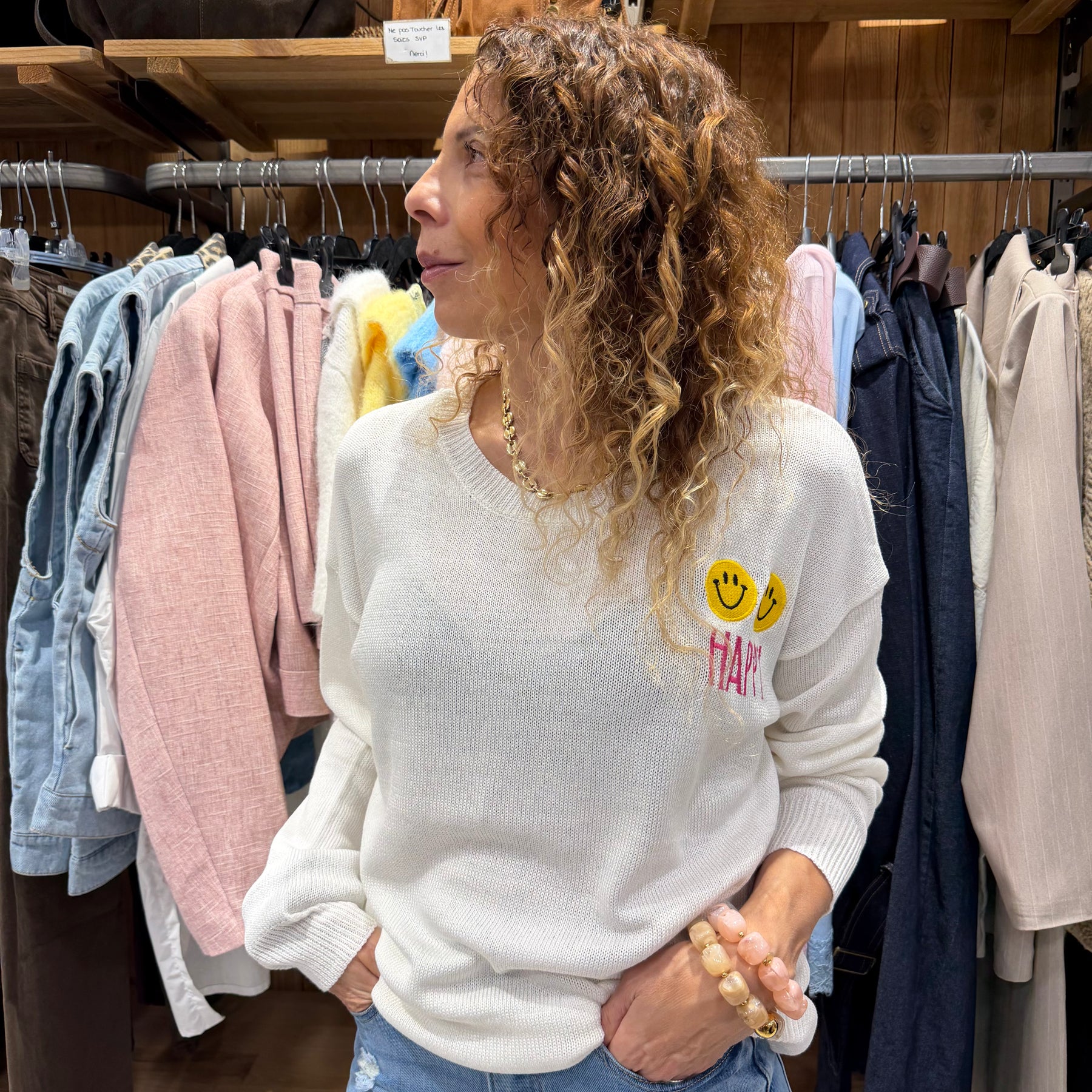 Apportez une touche de bonne humeur à vos looks avec cette maille fine ornée de jolis smileys colorés et d’un message positif.