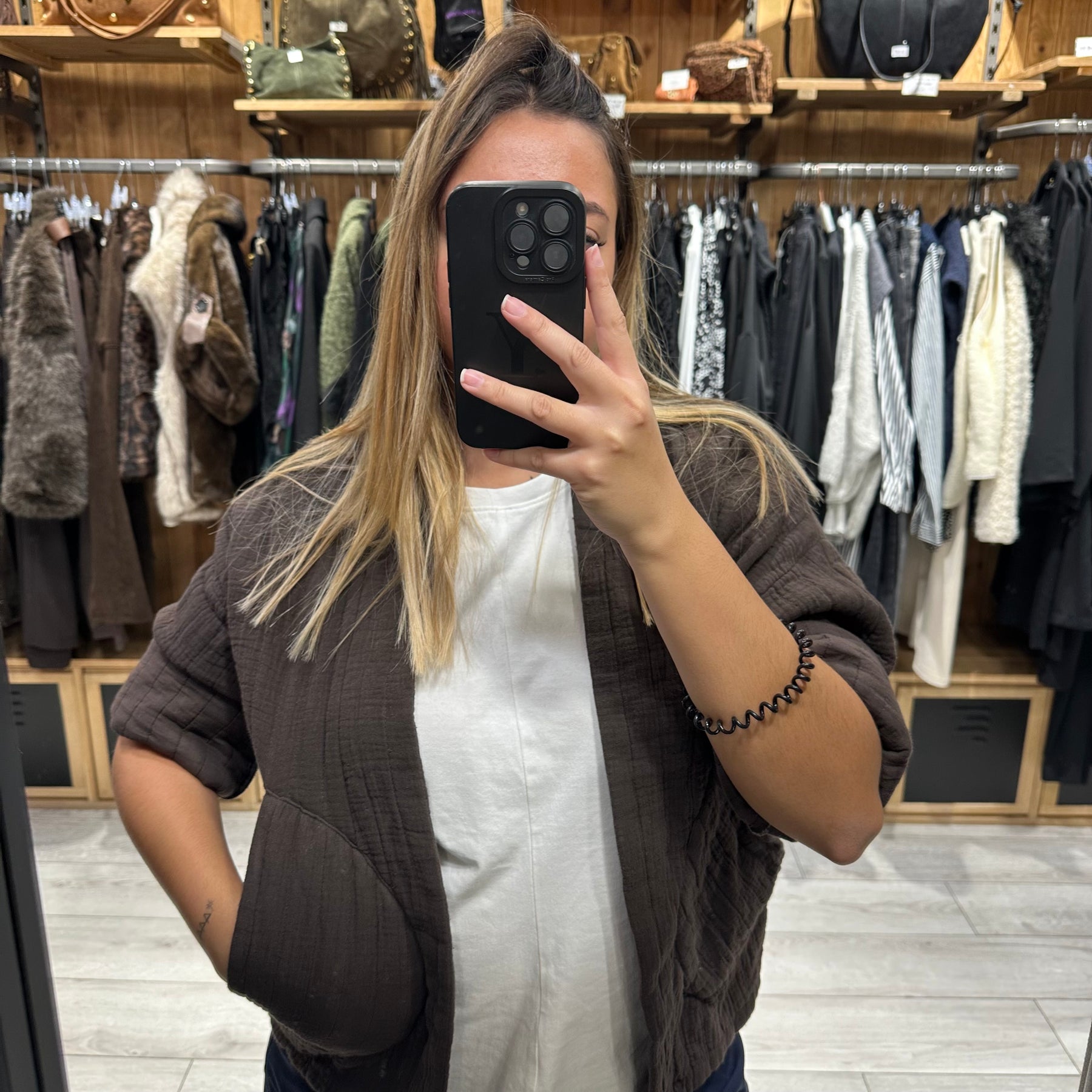 Confectionnée dans un tissu gaufré matelassé ultra doux, elle allie confort et style minimaliste. Sa coupe oversize légèrement arrondie et ses manches tombantes lui confèrent un look moderne et décontracté.